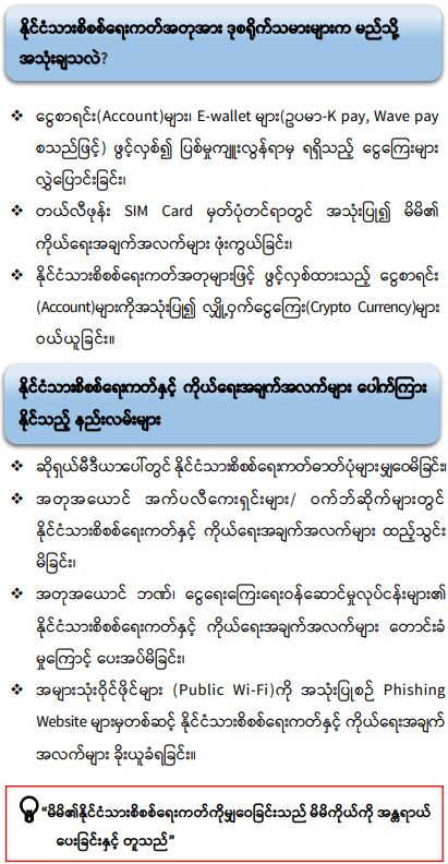 အွန်လိုင်းလိမ်လည်မှုကျူးလွန်ရာတွင် နိုင်ငံသားစိစစ်ရေးကတ်နှင့် ကိုယ်ရေးအချက်အလက်များအား ဒုစရိုက်သမားများ၏ တလွဲအသုံးချမှုမခံရစေရေးအတွက် ပြည်သူများ သိရှိလိုက်နာဆောင်ရွက်ရန် သတိပေးချက်